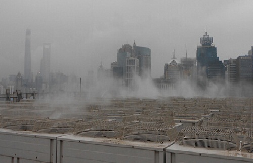 由于直冷系統(tǒng)(風(fēng)冷式中央空調(diào))是直接使用干空氣進行冷卻,因此直冷機組的出力取于進入冷凝器的空氣干求溫度。借鑒發(fā)電廠、化工和水泥行業(yè)的霧化增濕的實驗結(jié)果我們進一步研究發(fā)現(xiàn):在冷凝器進口采用霧化降溫方法可以有效的降低冷凝器入口空氣的溫度,顯著提高機組出力。霧化噴霧裝置,其工作原理是:水經(jīng)過高速旋轉(zhuǎn)的霧化電機形成1/800的粒徑的霧滴,在運動過程中霧滴與空氣充分混合并迅速蒸發(fā)。由于水的汽化潛熱較大,水蒸發(fā)時會大量吸收空氣中的熱量,從而降低空氣溫度。然后,降溫后的空氣將被空冷機組所吸收,以強化散熱的換熱效果。在一定的霧化強度和霧化角度下,霧還會散在散熱器的表面形成水膜,水膜的蒸發(fā)進一步帶走熱量,大大提高冷凝器的換熱能力,從而提高機組的出力。經(jīng)專業(yè)測試綜合節(jié)能率25%以上。