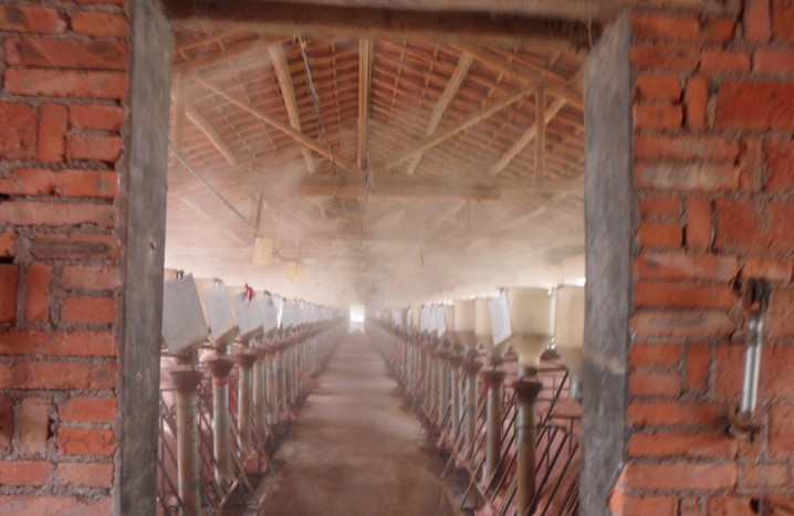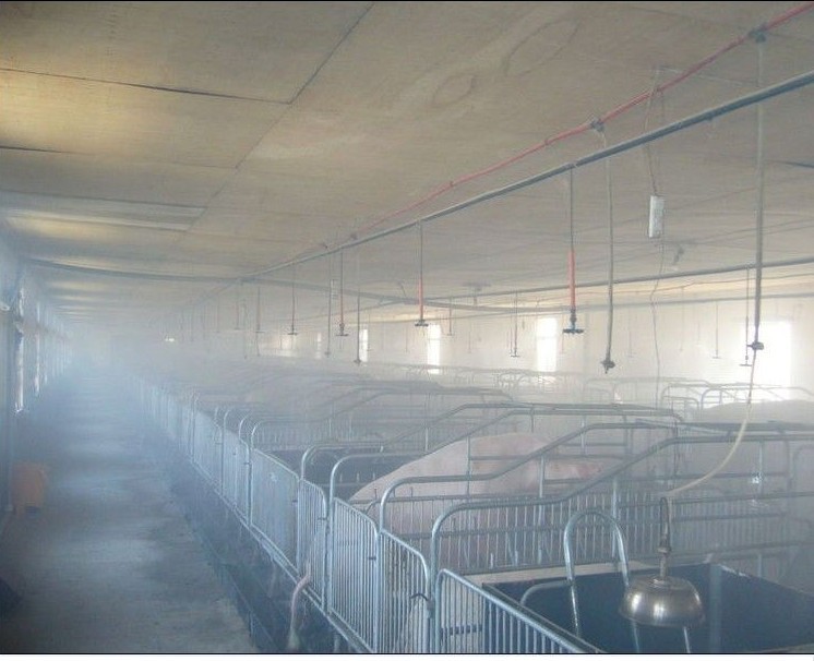 5.節(jié)省人力,創(chuàng)高利潤。經(jīng)試驗,在一幢長40、寬13的雙列式豬舍內(nèi)安裝噴霧降溫籠頭(每欄上方一只),使噴出的水成霧狀,降溫效果很好。白天使用,一般每間隔半小時開啟一次,每次持續(xù)時間為20分鐘左右。同時,豬舍一端安裝一只排風(fēng)扇通風(fēng)。前段時間,氣溫達到37以上的高溫日,白天舍內(nèi)最高氣溫降到35以下,早晨在30以下,工作人員從外面進入豬舍,有明顯涼爽的感覺。