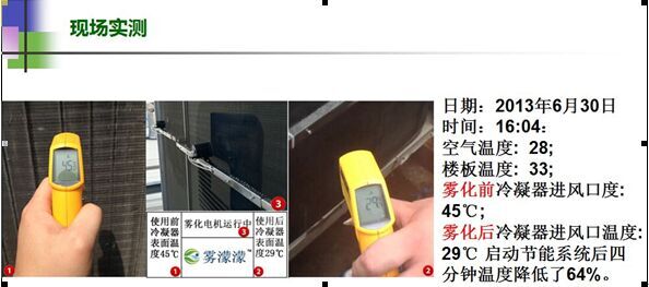 經(jīng)廣東福建兩省空調(diào)室外機(jī)安裝噴霧降溫系統(tǒng)試驗(yàn)測(cè)試,機(jī)房專用空調(diào)室外冷凝壓力在炎熱夏季從原先的2324kgf/cm2降低至1819kgf/cm2,下降4-5kgf/cm2。既冷凝溫度從60℃降低至50℃達(dá)10度之多,根據(jù)上述概算公式,粗略推算出機(jī)組的節(jié)能效率約為20%。
