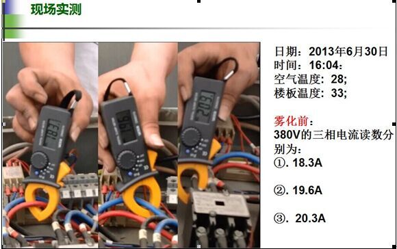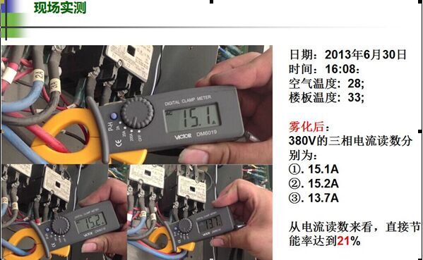 經(jīng)廣東福建兩省空調(diào)室外機(jī)安裝噴霧降溫系統(tǒng)試驗(yàn)測(cè)試,機(jī)房專用空調(diào)室外冷凝壓力在炎熱夏季從原先的2324kgf/cm2降低至1819kgf/cm2,下降4-5kgf/cm2。既冷凝溫度從60℃降低至50℃達(dá)10度之多,根據(jù)上述概算公式,粗略推算出機(jī)組的節(jié)能效率約為20%。